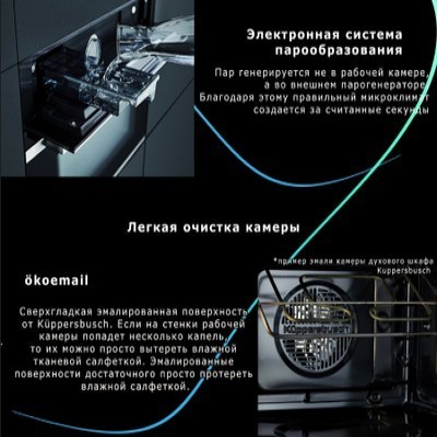 Компактный духовой шкаф с паром Kuppersbusch CBD 6550.0 Объем: 43 литра TFT-дисплей шириной 3,9" с текстовым и графическим полями 14 режимов духового шкафа 8 специальных режимов 6 режимов приготовления на пару 9 специальных режимов приготовления на пару Более 40 автоматических программ 20 избранных программ для сохранения индивидуальных настроек Электронная система управления с сенсорными кнопками Отображение фактической температуры и рекомендуемой Электронный таймер (продолжительность программы, окончание, таймер обратного отсчета) с белыми индикаторами Съемная дверца с полностью стеклянной внутренней поверхностью Четырехслойное остекление дверцы Быстрый разогрев Экономичный режим Демо-режим Режим ожидания Галогенная подсветка Контактный дверной выключатель Катализатор Okoterm очищает воздух во время приготовления, таким образом стенки духового шкафа всегда абсолютно чистые! В отличие от энергоёмкой технологии пиролиза (разрушение частиц грязи путём дожигания) при температуре около 500°С, okotherm® не требует дополнительного времени и дополнительных затрат электроэнергии. Режимы работы Верхний и нижний нагрев Подача тепла сверху и снизу обеспечивает равномерное приготовление продуктов, расположенных на одном уровне. Прекрасно подходит для выпечки пирожных и пирогов, например, изделий из дрожжевого теста, чизкейков и т. д. Обдув горячим воздухом с Okotherm Вентилятор распределяет тепло, генерируемое кольцевым нагревательным элементом, который расположен на задней стенке рабочей камеры. Обеспечиваемая таким образом одинаковая температура по всему объему рабочей камеры гарантирует равномерное приготовление блюд на всех уровнях направляющих, не ухудшая их вкус и запах Верхний и нижний нагрев с обдувом горячим воздухом Тепло, генерируемое верхним и нижним нагревательными элементами, равномерно распределяется по объему рабочей камеры с помощью вентилятора. Прекрасно подходит для выпечки и жарения Режим "пицца" с Okotherm Сочетание нижнего нагрева и обдува горячим воздухом оптимально подходит для приготовления изделий в виде хрустящей основы с мягкой начинкой. Идеально для пиццы, печенья или выпечки с начинкой из фруктов и паштетов Нижний нагрев Благодаря теплу, генерируемому только нижним нагревательным элементом, данный режим прекрасно подходит для приготовления изделий с хрустящей основой или для получения более коричневой корочки снизу. Прекрасно подходит для приготовления очень мягких фруктовых пирогов и для легкого запекания тестовой основы пирогов перед приготовлением Верхний нагрев Тепло, генерируемое верхним нагревательным элементом, прекрасно подходит для запекания и подрумянивания блюд ECO Режим ECO позволяет уменьшить энергопотребление при приготовлении блюд. Для снижения потребления электроэнергии, духовой шкаф автоматически отключается за несколько минут до окончания приготовления блюда, используя тепло, остающееся в рабочей камере, для доведения блюда до готовности Интенсивный обдув горячим воздухом с Okotherm Включенный верхний нагревательный элемент, помимо обдува горячим воздухом, используется для создания хрустящей корочки и подрумянивания блюда. Прекрасно подходит для приготовления запеченного картофеля, жарения или запекания Гриль + нижний нагрев Тепло от нижнего нагревательного элемента и распол